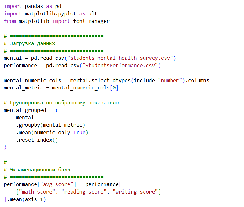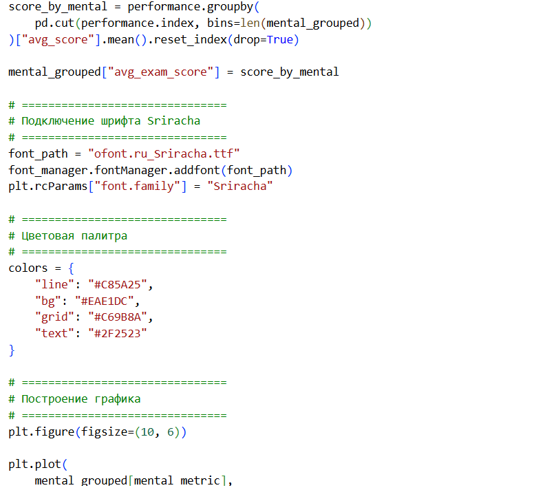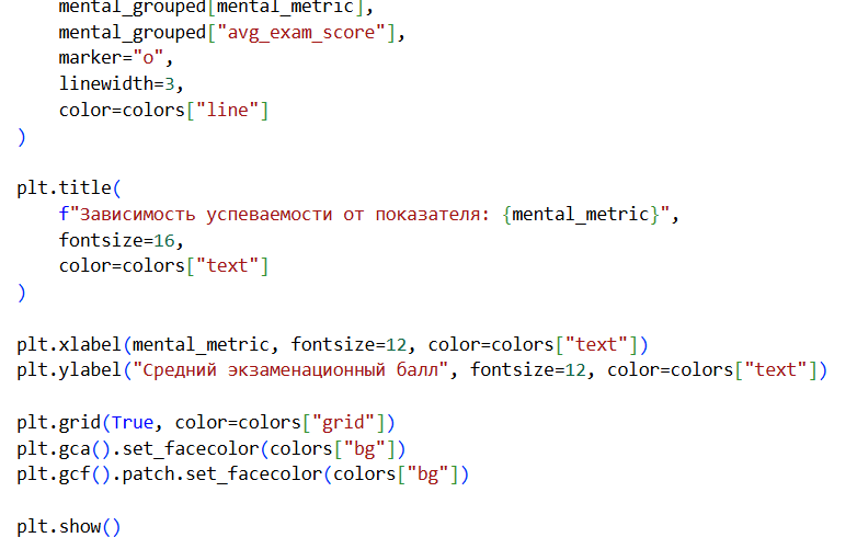Для анализа был автоматически выбран количественный показатель ментального состояния студентов, что позволило обеспечить универсальность обработки данных и построить визуализацию зависимости академической успеваемости от психологических факторов.
