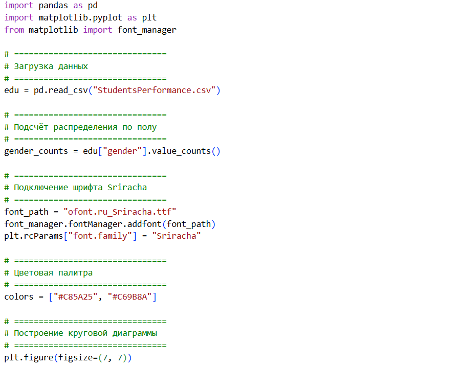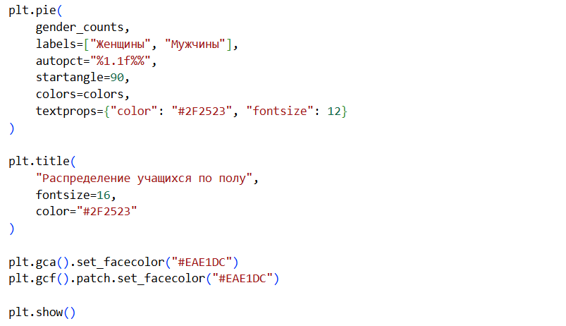 Круговая диаграмма отражает распределение учащихся по полу в исследуемом наборе данных. Можно заметить, что доли мужчин и женщин представлены относительно равномерно, что говорит о сбалансированности выборки. Данный факт важен для дальнейшего анализа академической успеваемости, так как снижает вероятность смещения результатов, связанного с гендерным фактором.