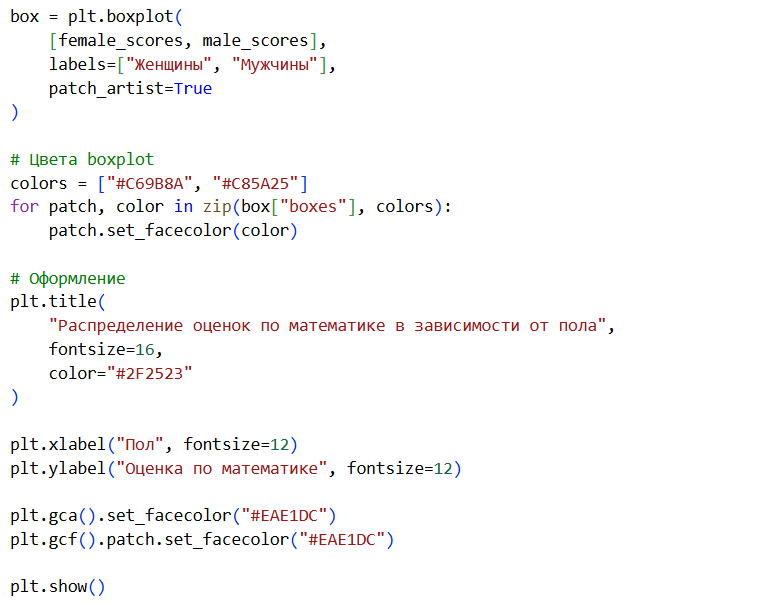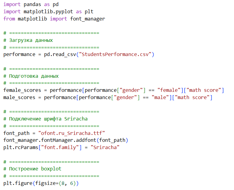 Boxplot демонстрирует распределение оценок по математике среди учащихся в зависимости от пола. Видно, что медианное значение у девушек несколько выше, чем у юношей, а также наблюдается различие в разбросе оценок. Наличие выбросов указывает на индивидуальные случаи крайне низких или высоких результатов. Данная визуализация позволяет наглядно оценить различия в успеваемости между группами.