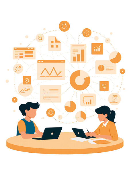 Editorial-style cover illustration for a student data visualization project. Silhouettes of students studying, abstract charts floating around them (graphs, statistics, dashboards). Focus on education, learning, mental well-being. Soft warm color palette (
