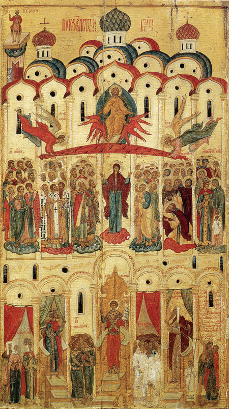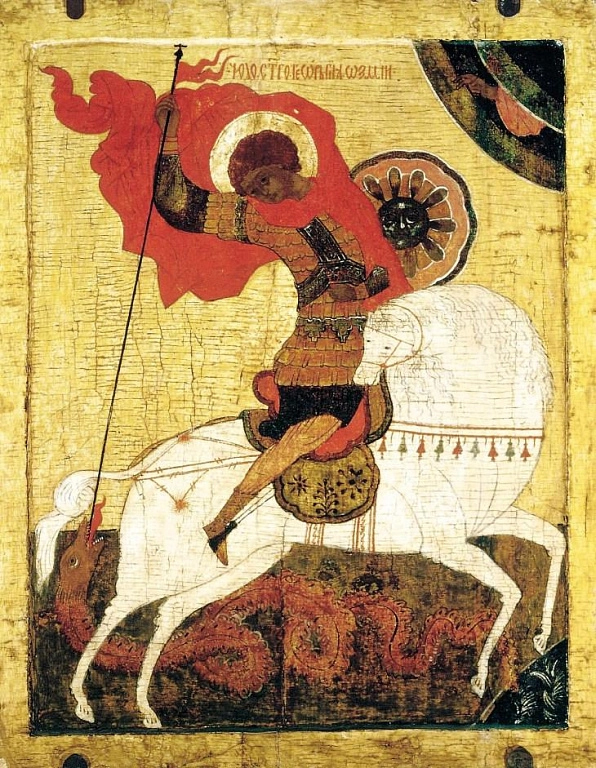 1. Икона «Чудо Георгия о змие». Новгородская икона, конец XIV — начало XV вв. 2. Икона «Покров Пресвятой Богородицы». Новгородская икона, около 1530 г.