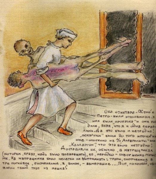 Ефросинья Керсновская, проведя 20 лет в ГУЛАГе, создала уникальное графическое свидетельство лагерной жизни. Её мемуары, дополненные рисунками, фокусируются на истерзанном человеческом теле: измождённые узники, сцены с пытками холодом и люди, доведённые до полного бессилия непосильным трудом. Эти работы обладают мощной силой воздействия, позволяя зрителю ощутить нечеловеческие страдания, пережитые заключёнными.