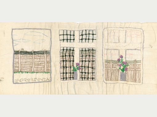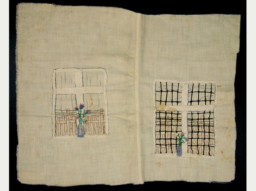 Еще один пример, когда женщины использовали вышивку как средство символического сопротивления, изображая на ней вид из лагерного окна. За колючей проволокой и глухим забором они намеренно помещали яркий букет цветов. Этот акт творчества становился новым способом увидеть красоту в нечеловеческих условиях